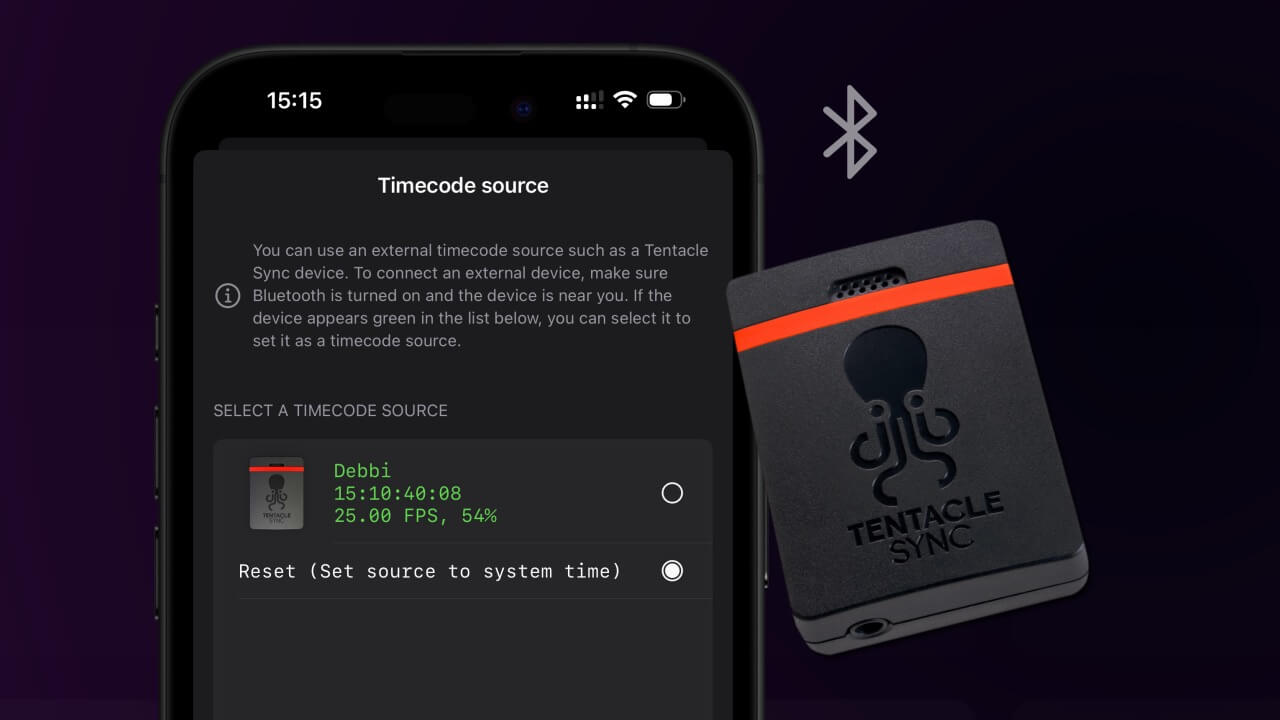 Aplikácia podporuje používanie externého časozberného zariadenia cez Bluetooth. Stačí sa uistiť, že je časozberné zariadenie aktívne a v blízkosti, a môžete synchronizovať s časovým kódom určeným zariadením. To je užitočné pri práci na súbore, kde sa časový kód používaný kamerami môže líšiť od denného času (TOD).