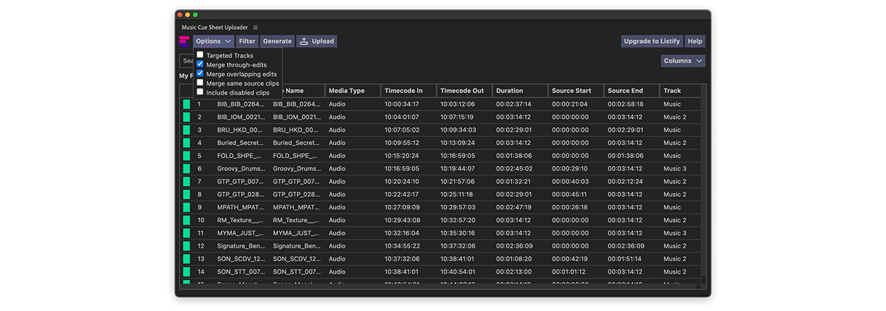 With one click, the list can be uploaded to the Music Cue Sheet Manager on EditingTools.io, where additional metadata can easily be added.