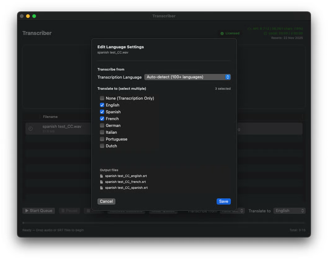 TT requires macOS 13+. There is a 1GB file limit for ElevenLabs uploads (use MP3s for very long files). If a translation fails, you can simply retry the specific SRT without re-transcribing.